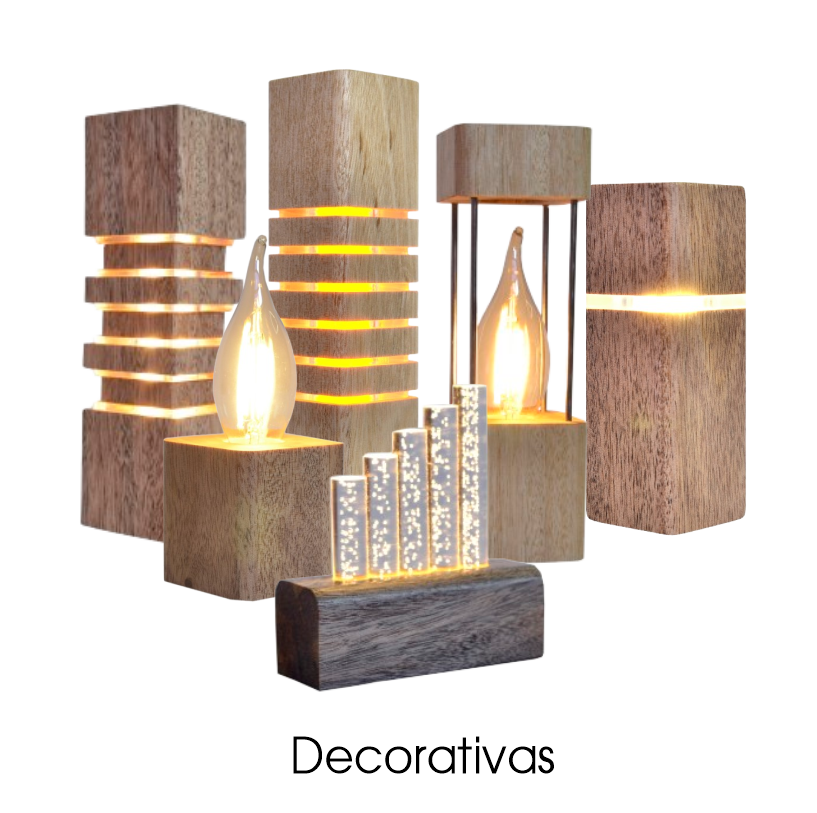 fabricadas em madeira e acrílico com LEDs e fonte integrada, ideal para uso