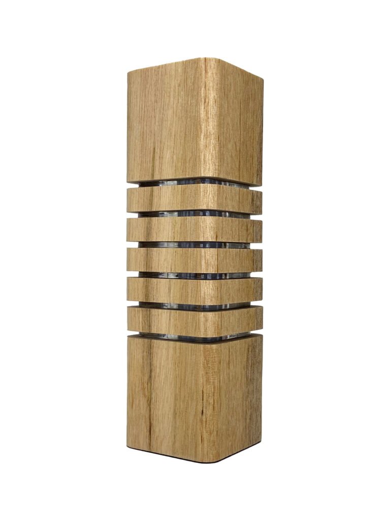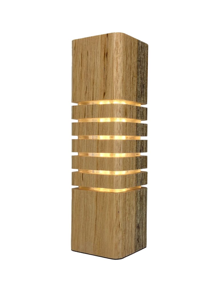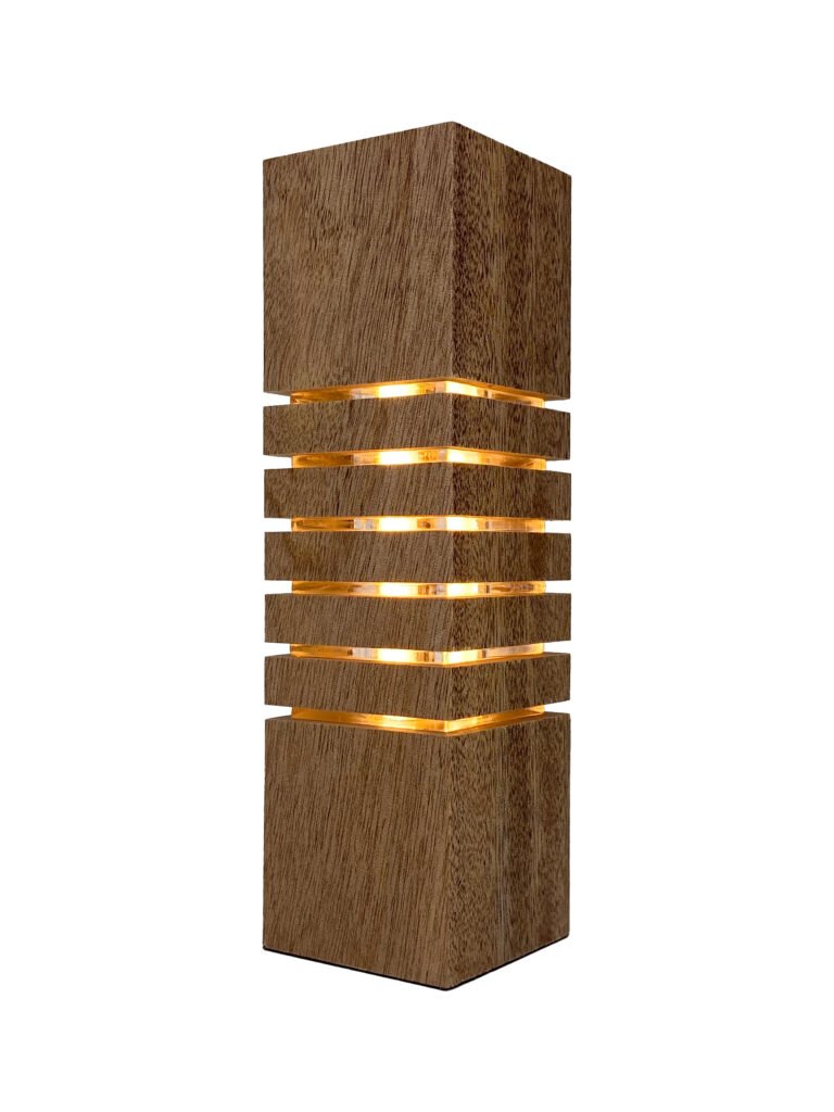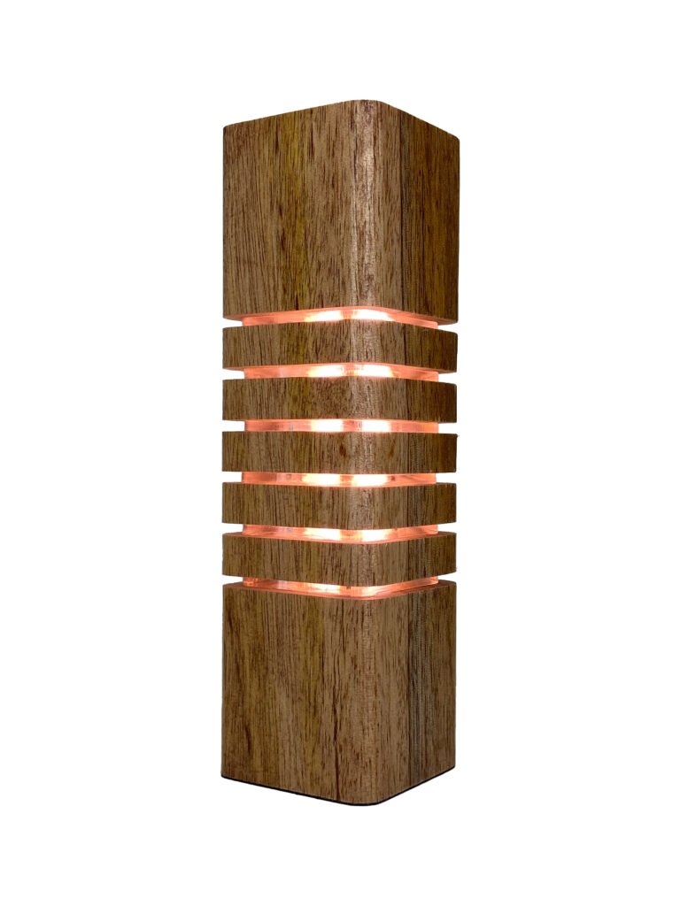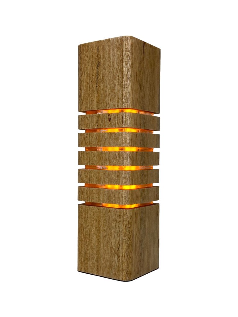 Luminária decorativa fabricada em Madeira e Acrílico com LEDs e Fonte Integrada, Cabo de 1,5m e Interruptor, Base em Tecido Macio e Embalagem com Berço para Presente em Camurça com Fita Cetim Perlucce.