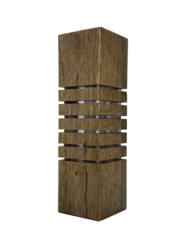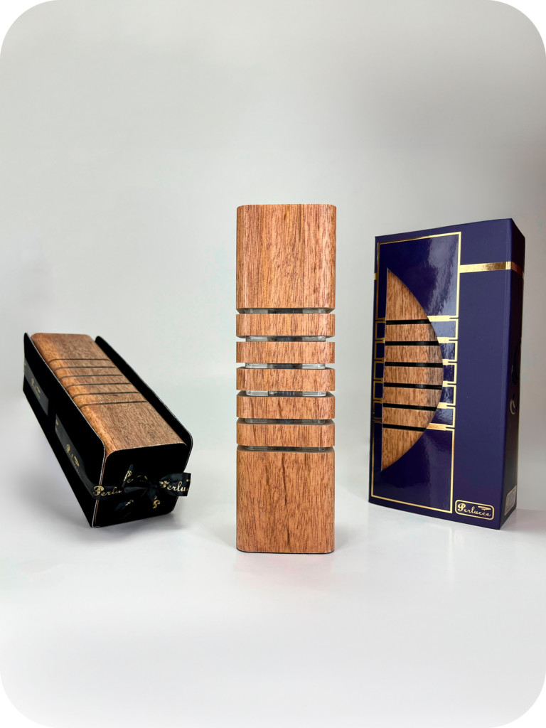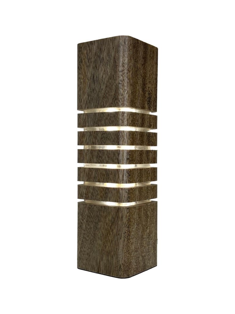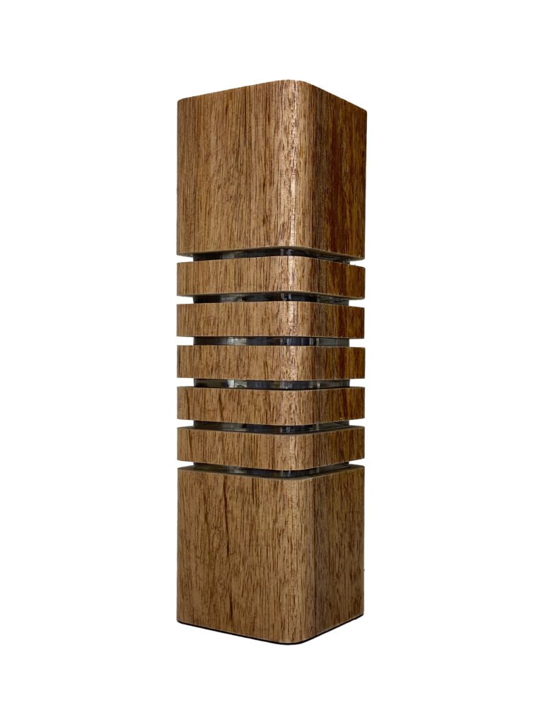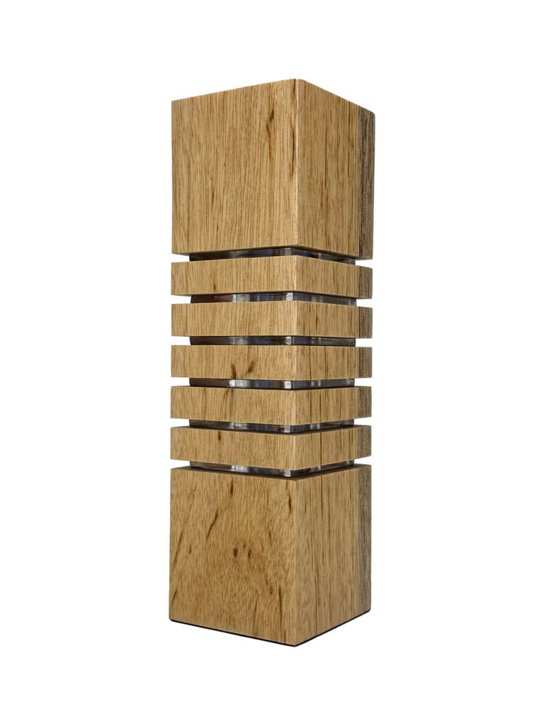 Luminária decorativa fabricada em Madeira e Acrílico com LEDs e Fonte Integrada, Cabo de 1,5m e Interruptor, Base em Tecido Macio e Embalagem com Berço para Presente em Camurça com Fita Cetim Perlucce.